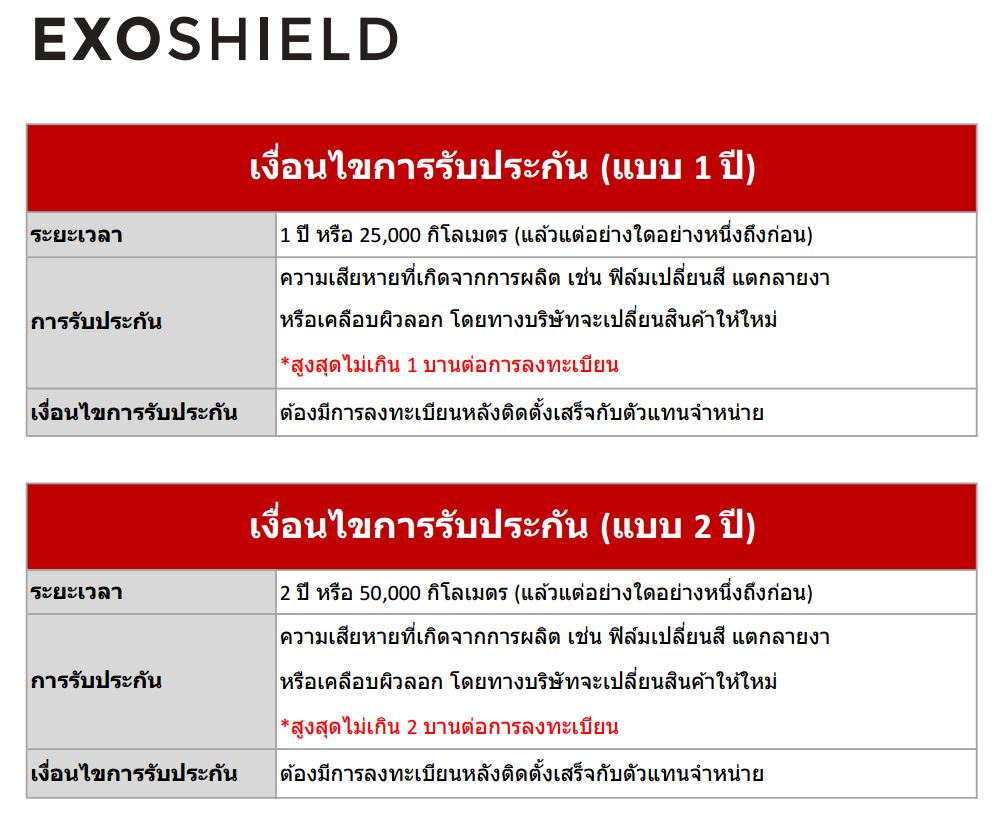 ExoShield มีการรับประกันที่ยาวนานที่สุดในท้องตลาด โดยลูกค้าสามารถเลือกระยะการรับประกันได้สูงสุดถึง 2 ปี / 50,000 กิโลเมตร.